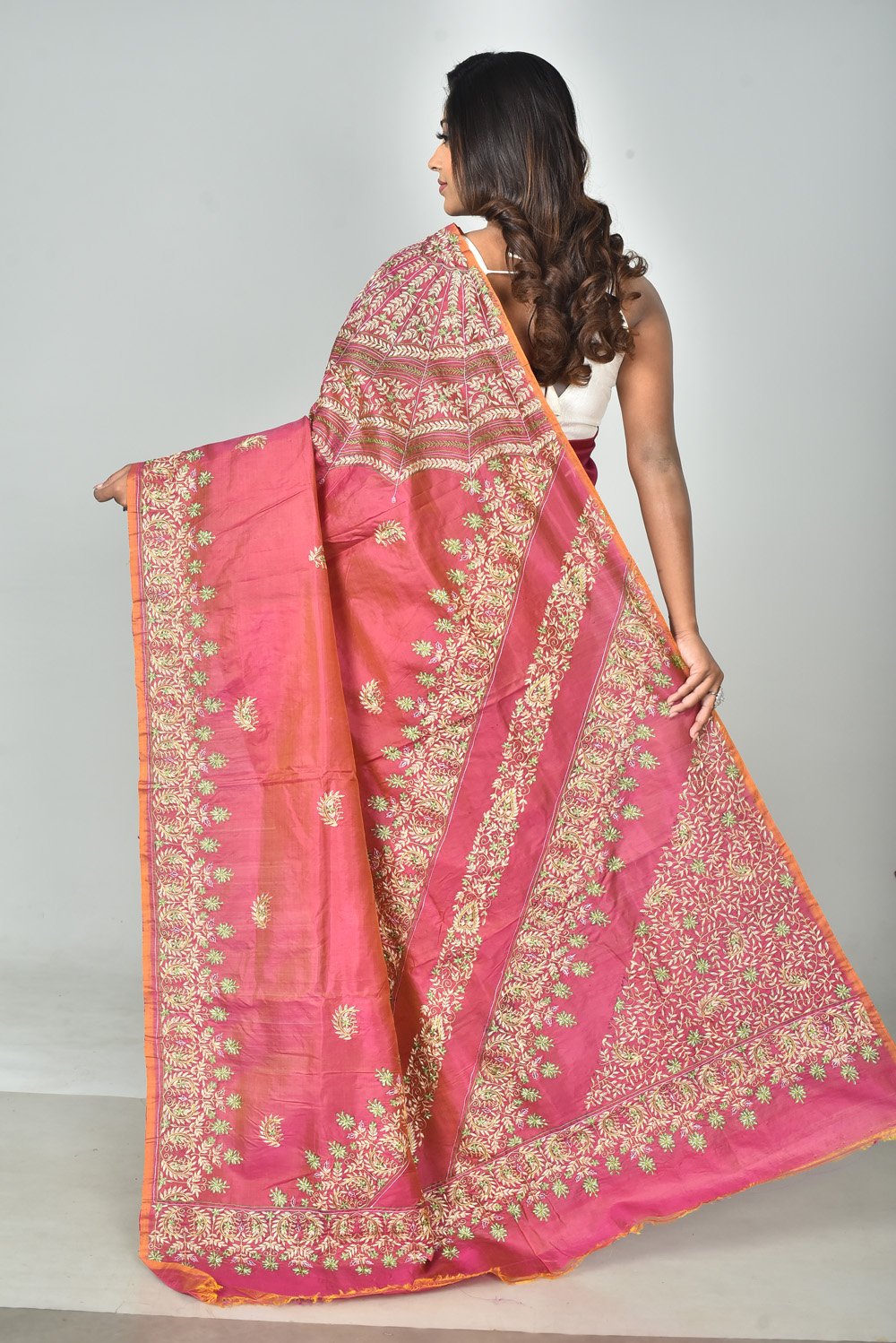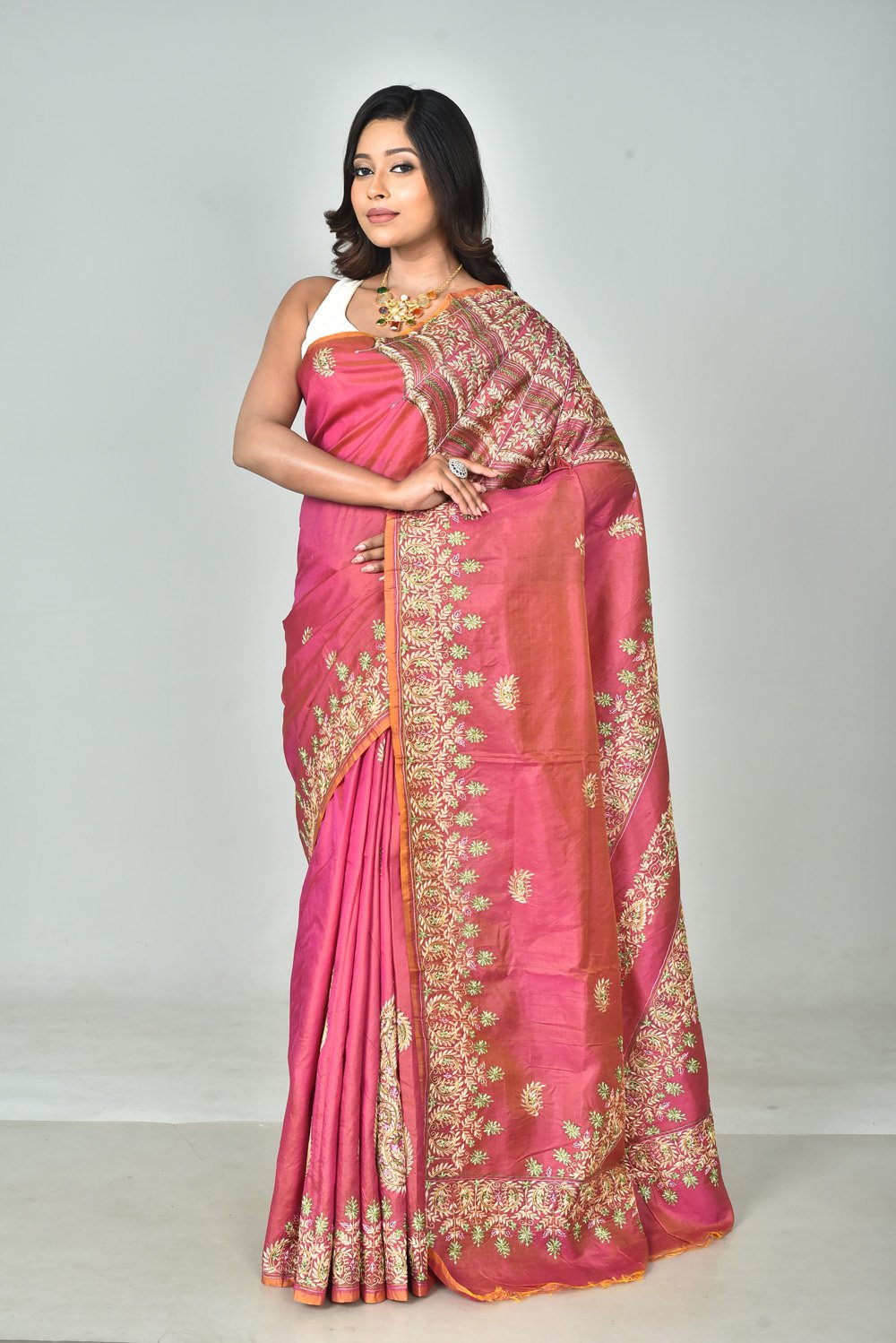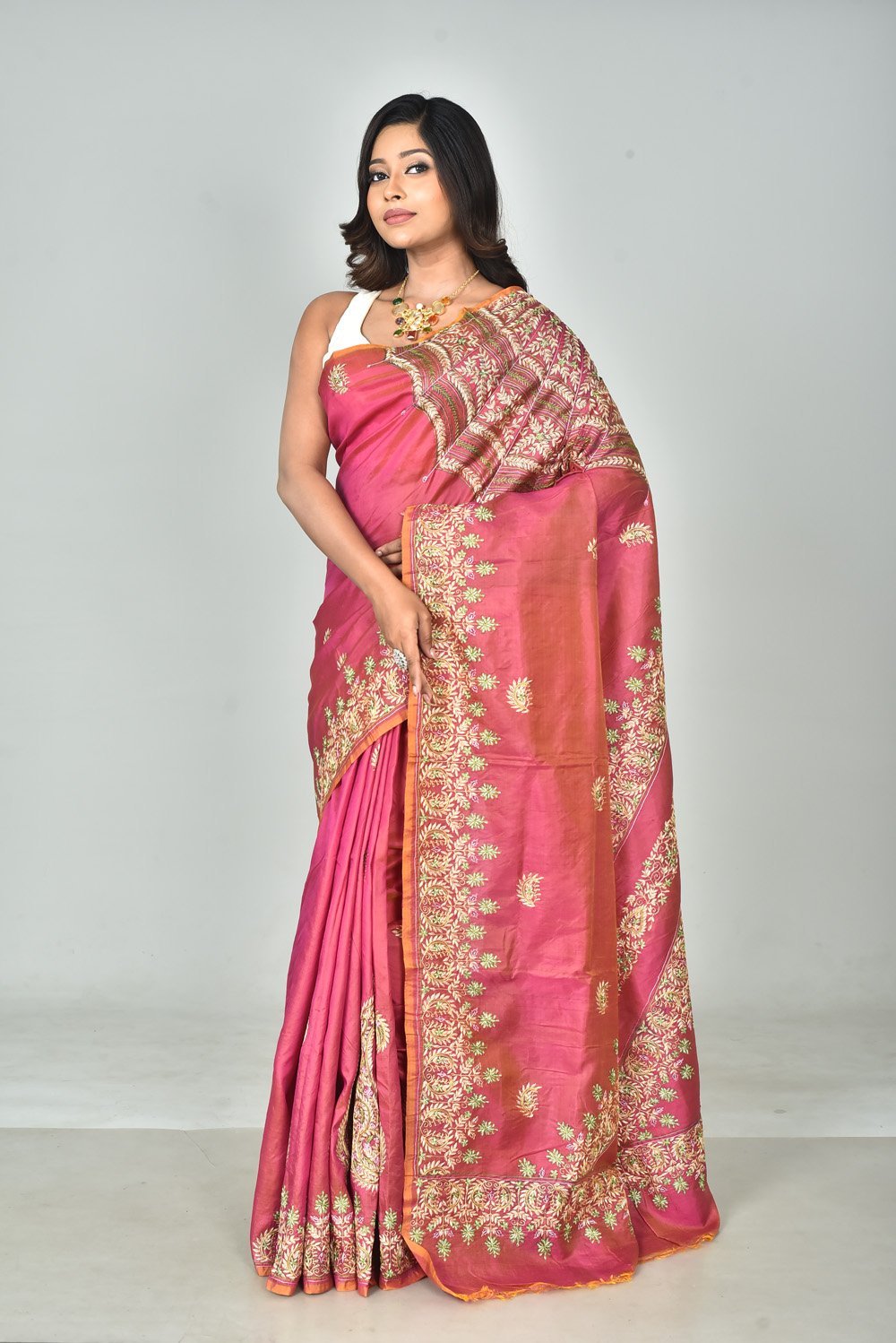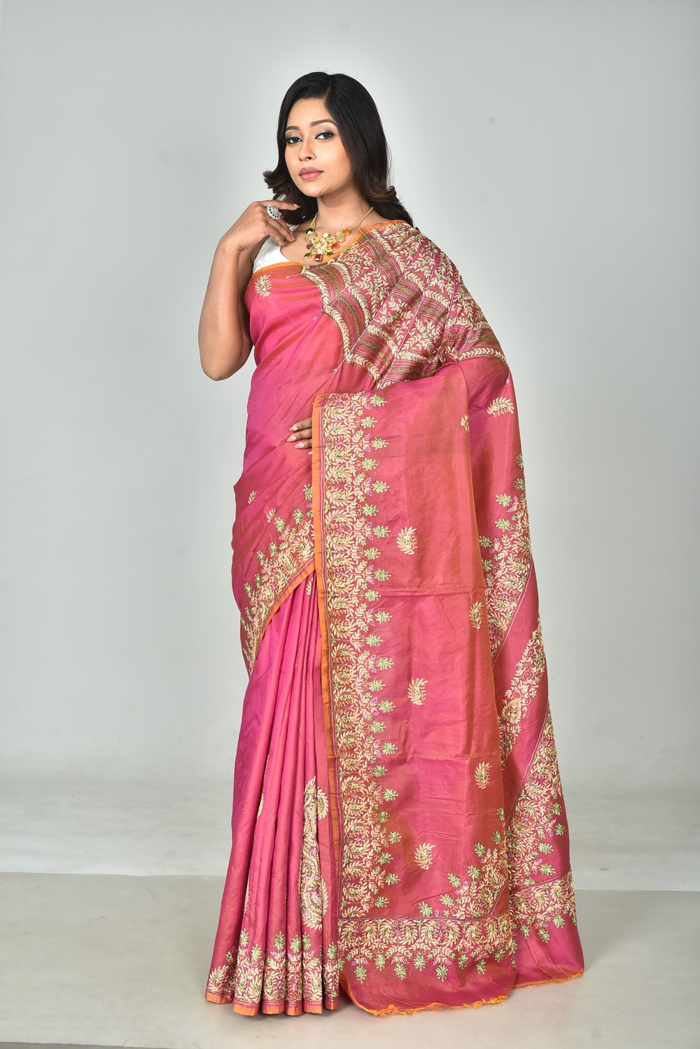 Elevate your ethnic wardrobe with this exquisite Bishnupuri dual-tone silk saree, adorned with intricate Kashmiri stitch embroidery. Crafted with luxurious silk, its rich dual-tone sheen enhances the elegance of the intricate floral motifs. The beautifully embroidered border and pallu add a touch of opulence, making it perfect for festive occasions and celebrations. This saree comes with a matching blouse piece to complete your timeless look.