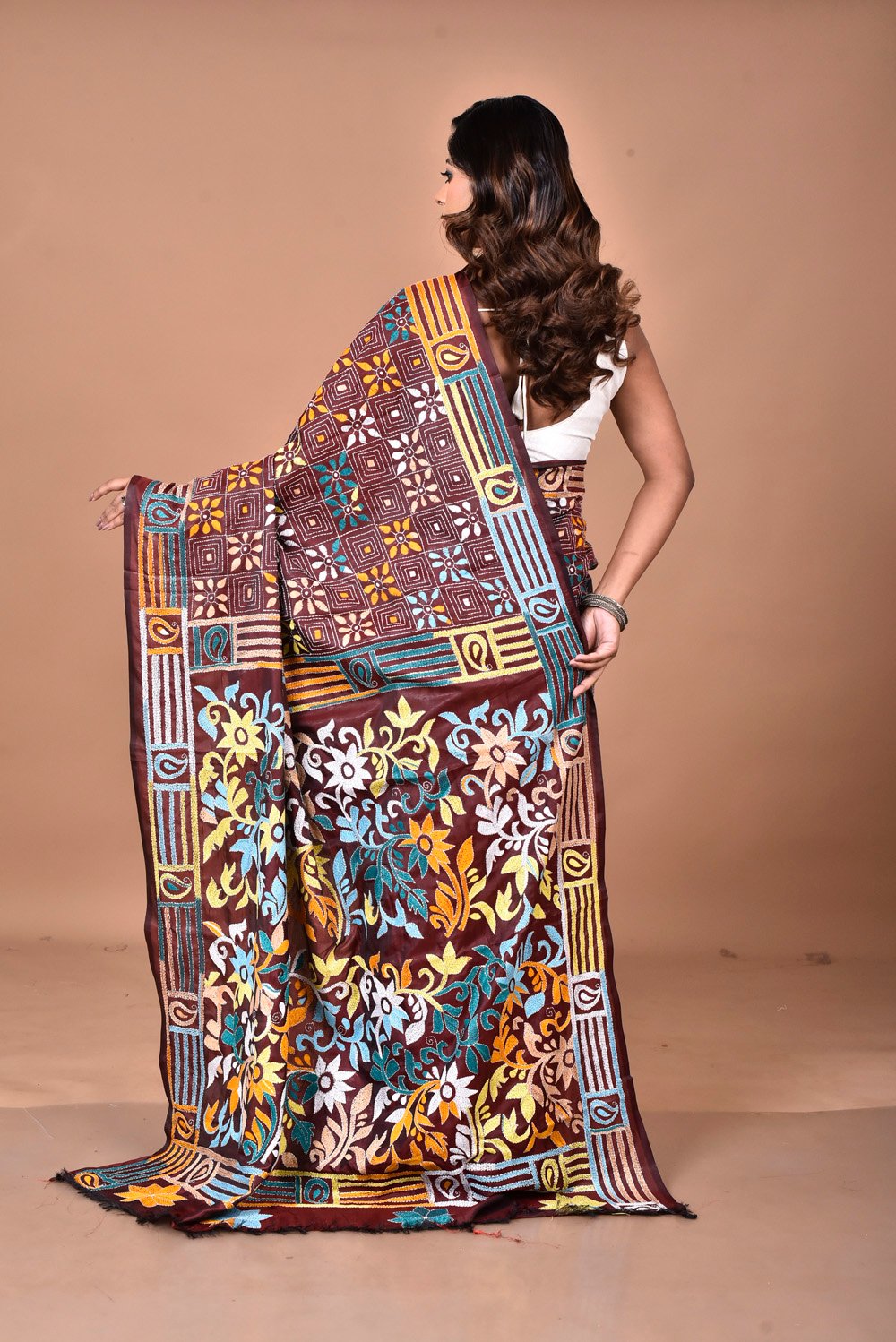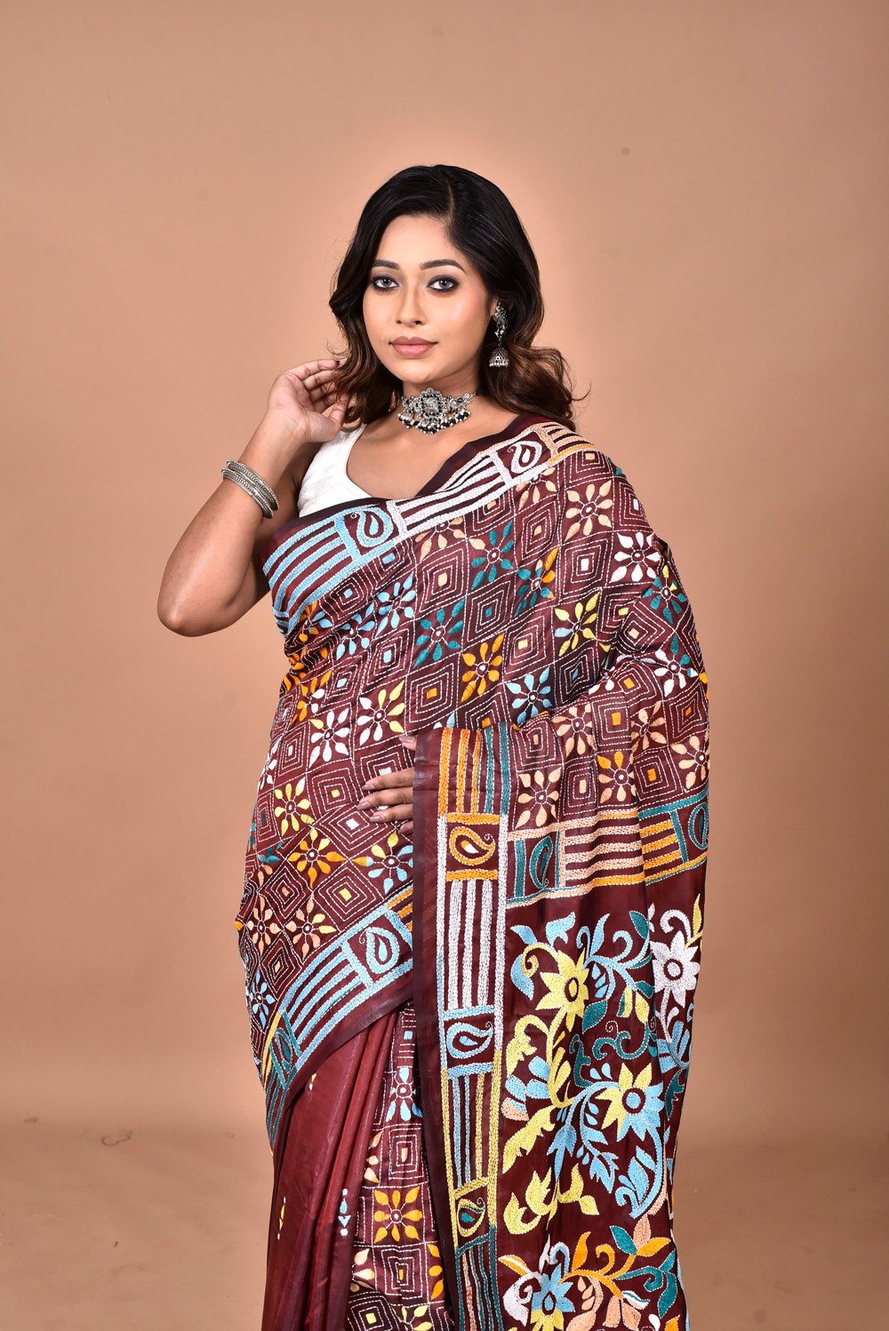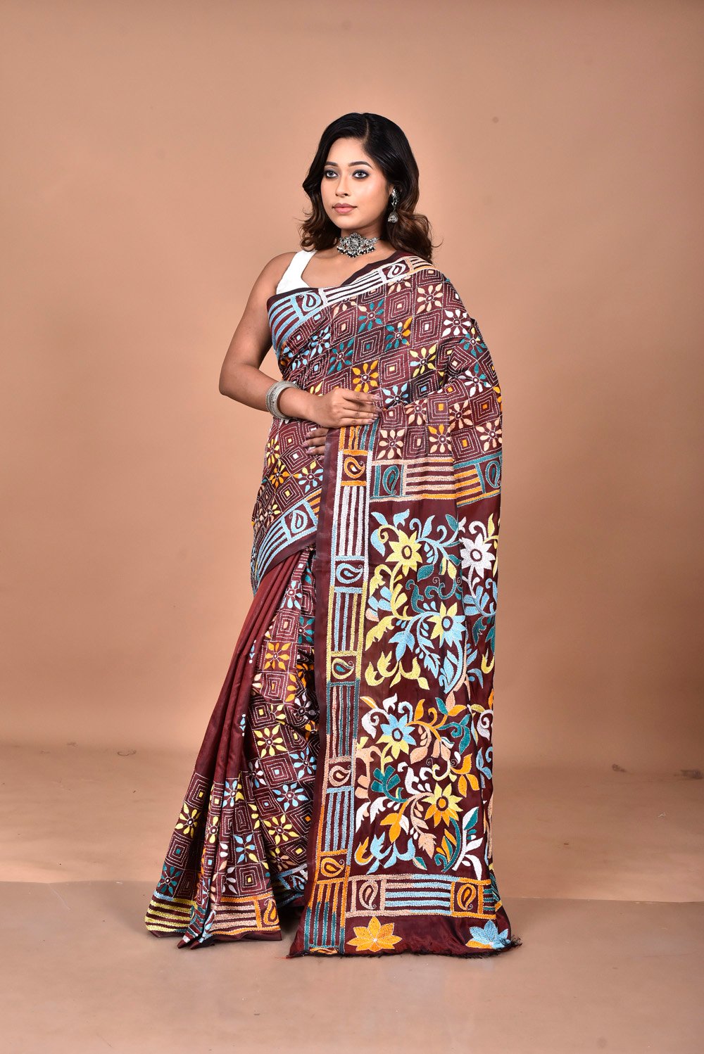 Blended Bangalore Silk saree all over kantha stich with Blouse piece