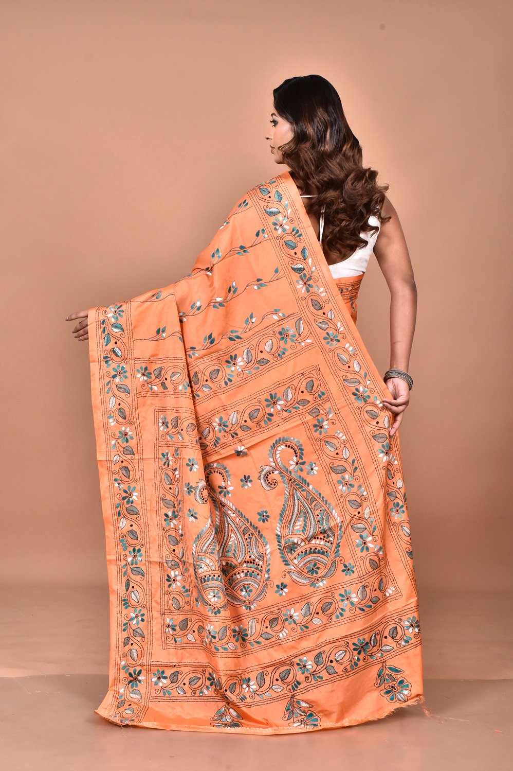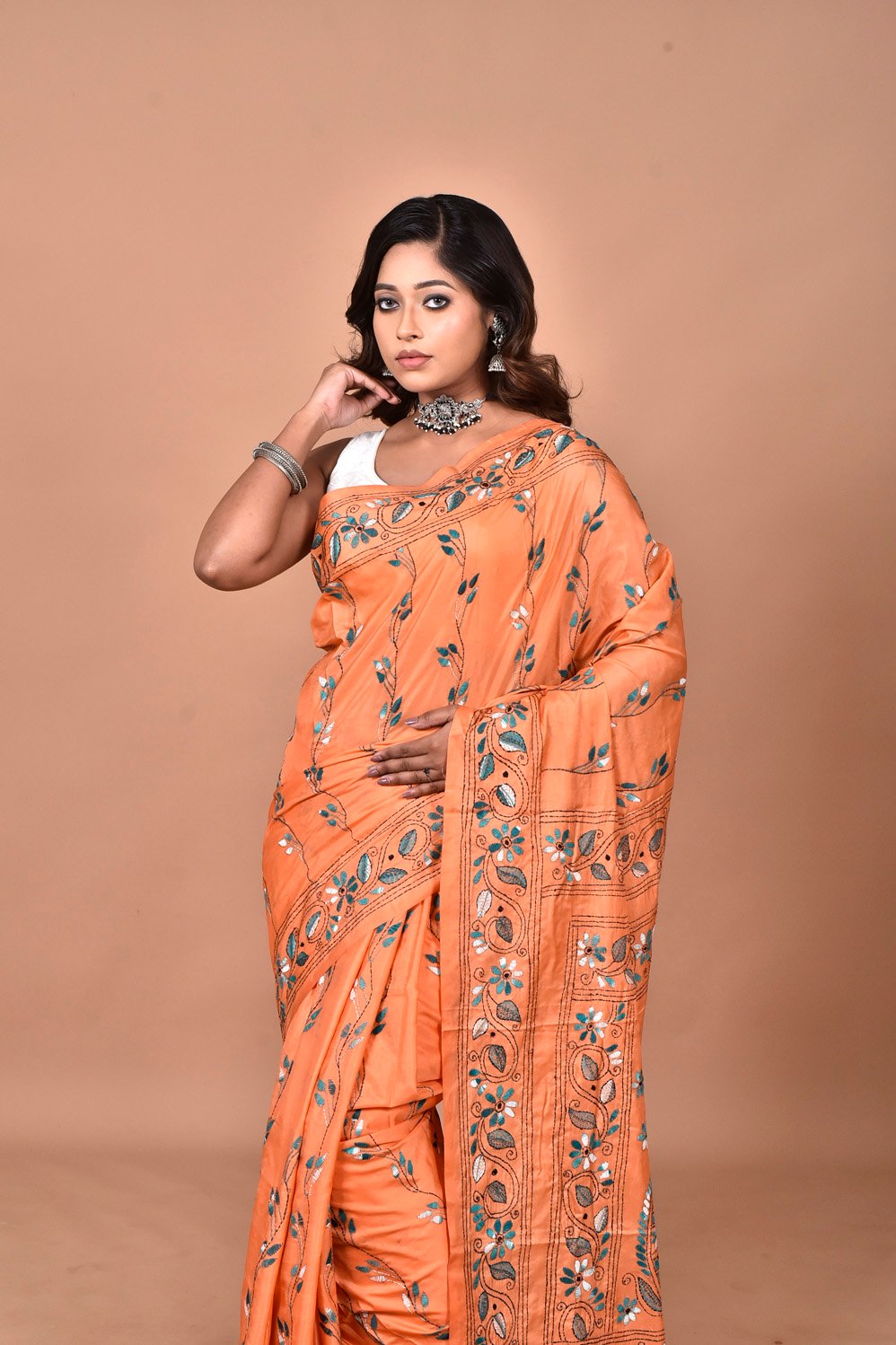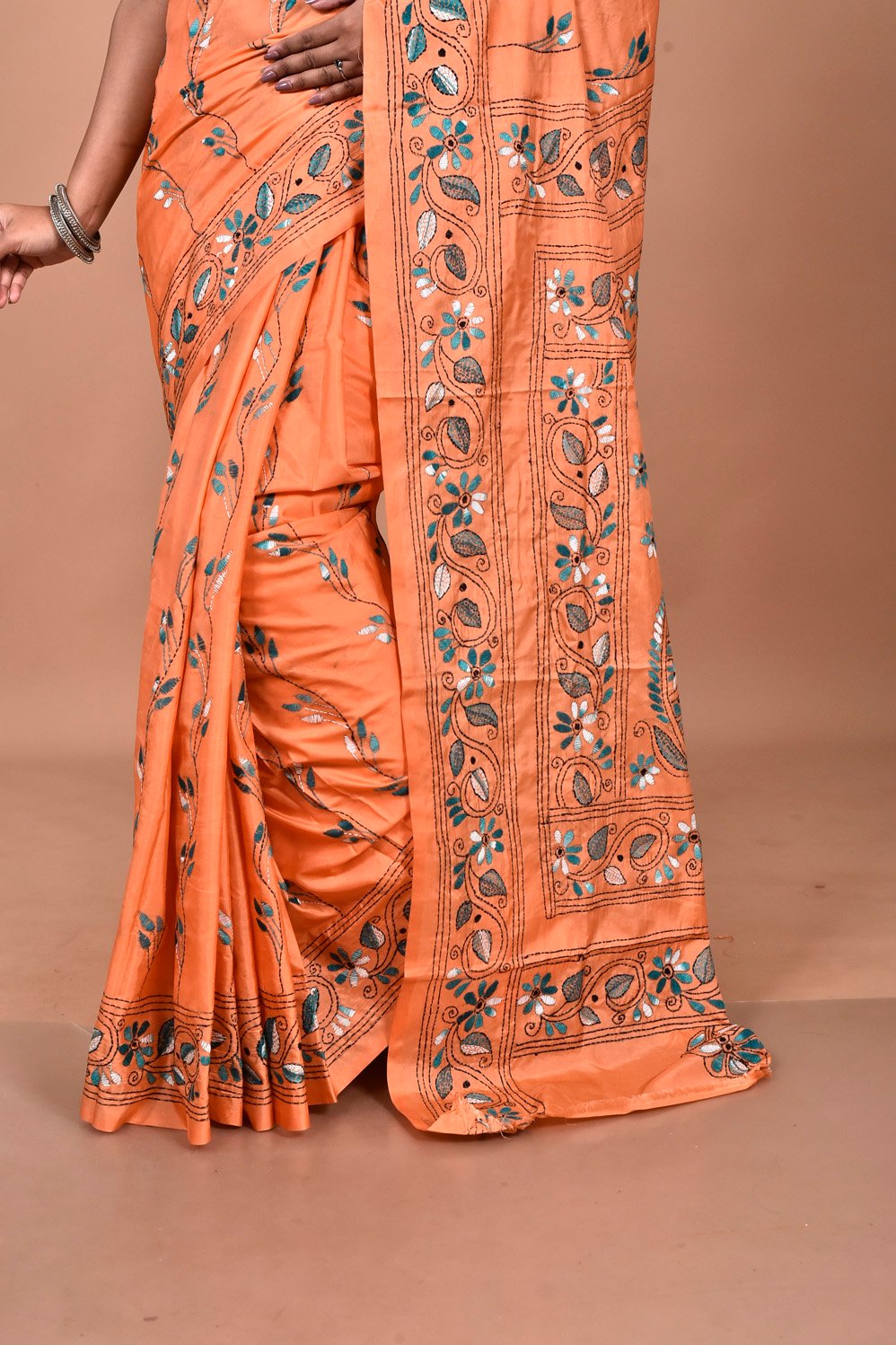 Embrace the beauty of tradition with this exquisite Blended Bangalore Silk Kantha Stitch Saree, a masterpiece of fine craftsmanship. The intricate hand-embroidered Kantha stitch work adds a touch of heritage charm to the luxurious silk fabric, making it a perfect choice for special occasions and festive wear.