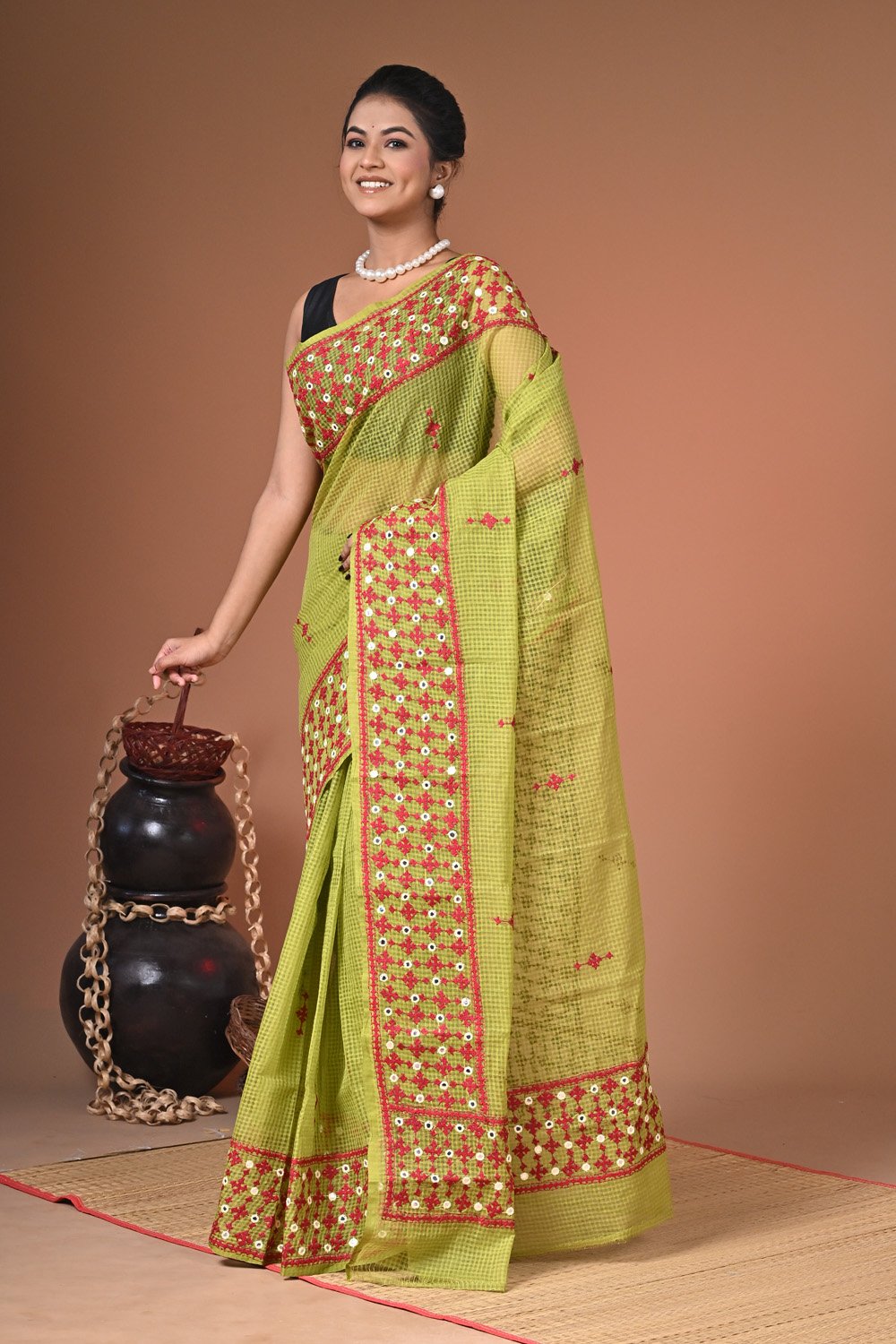 Step into timeless elegance with the Hand Embroidery Resom Check Saree with Mirror Work from Love of Fashion. This saree beautifully combines the subtle charm of resom check fabric with artisanal hand embroidery, further elevated by shimmering mirror accents. The result is a piece that radiates sophistication while adding a touch of festive glamour.