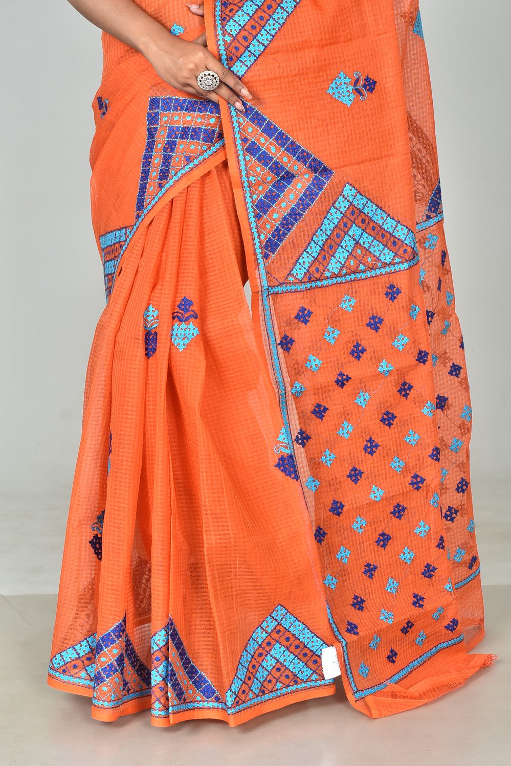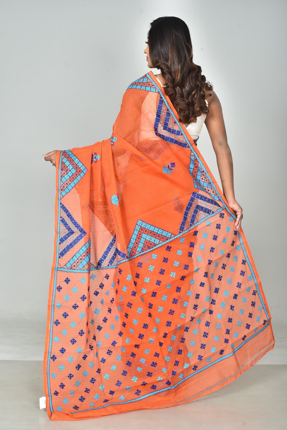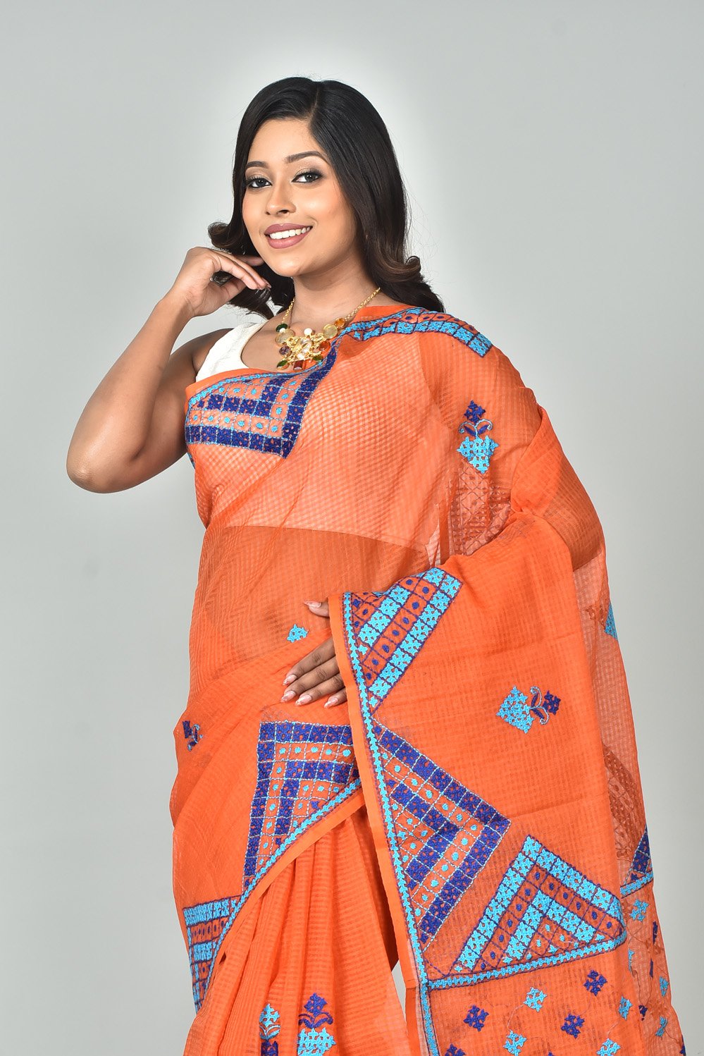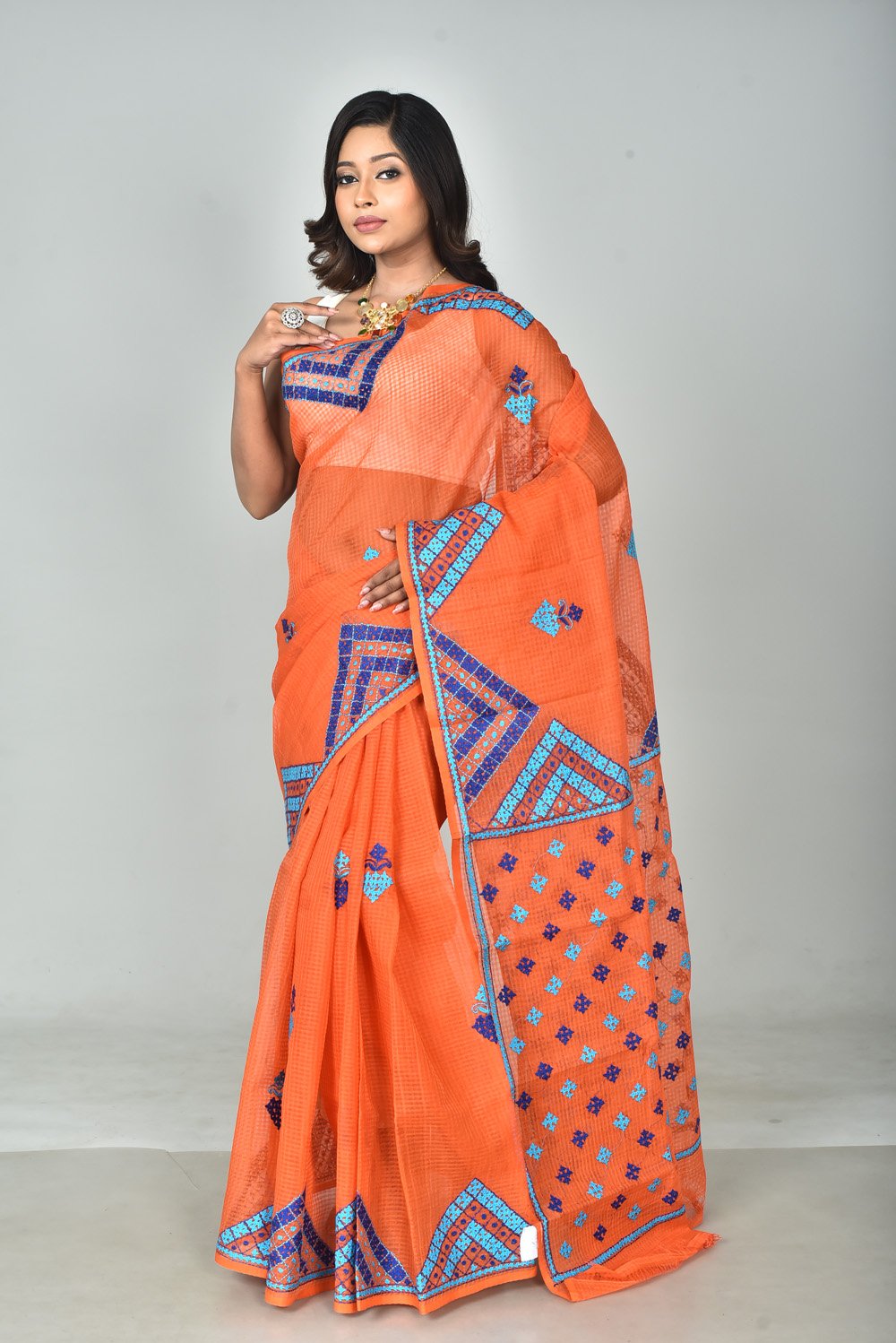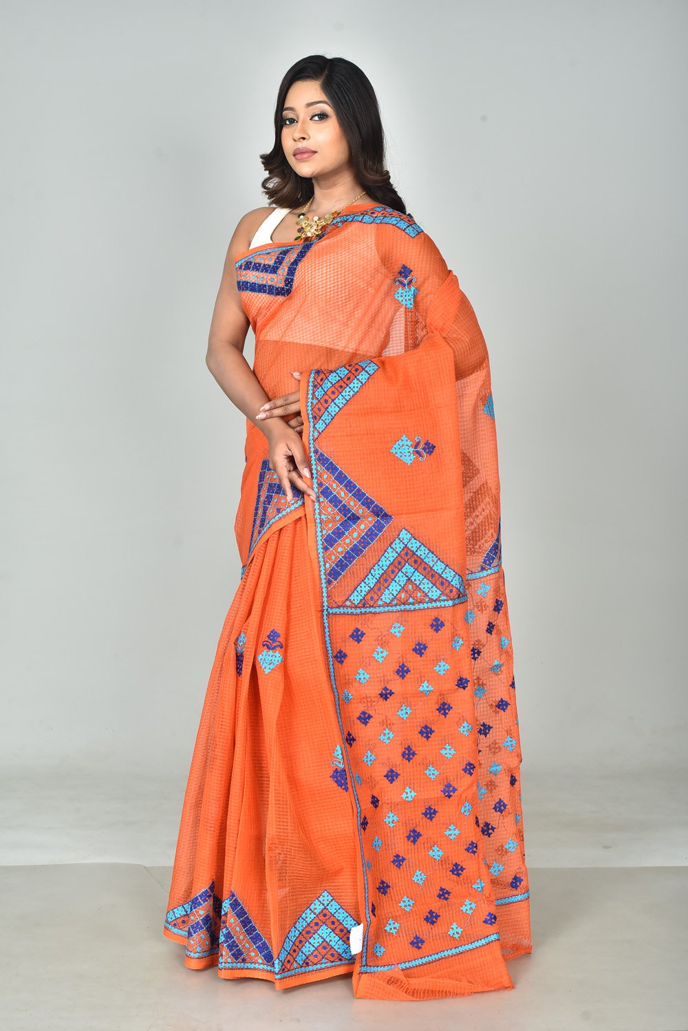 Drape yourself in heritage with our exquisite Resom Check Gujarati Stitch Saree. This saree beautifully merges the charm of classic check patterns with intricate Gujarati stitch embroidery, creating a stunning fusion of tradition and contemporary appeal.